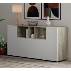 Aparador de 3 puertas modelo Dover-W, fabricado en melamina de alta calidad, canteado en PVC. Aparador moderno de estilo Nórdico económico, con un diseño que no pasa desapercibido. Además cuenta con un estante por puerta. Medidas: 154x41x75 cm. de alto.Color: Blanco Brillo / Roble. Se sirve desmontado en kit con herrajes...