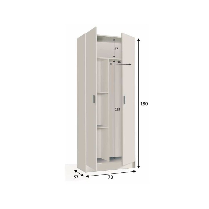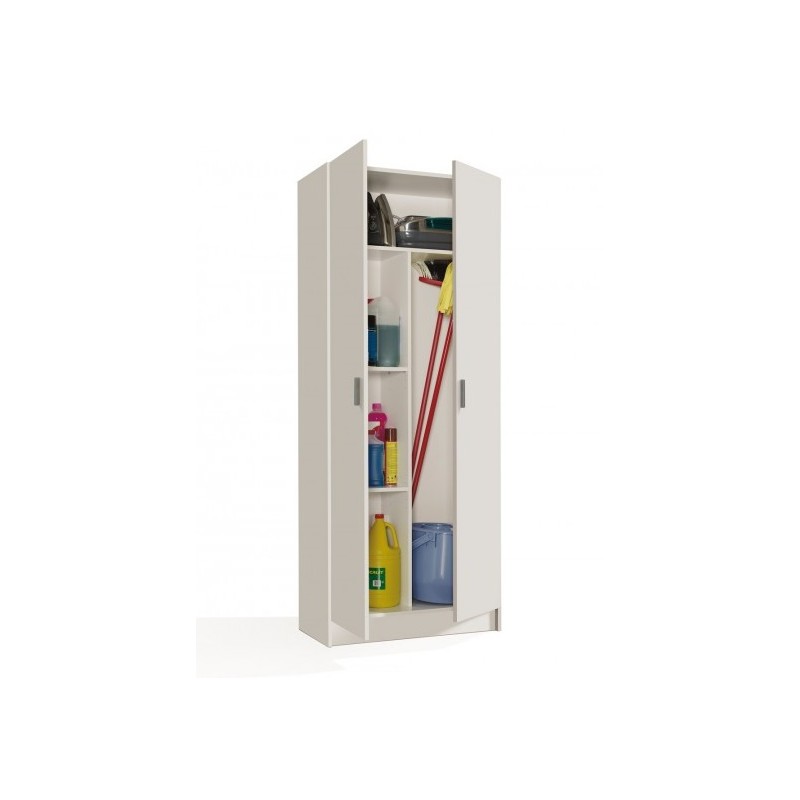 Armario multiusos escobero de 2 puertas mod. Lans, acabado en melamina de alta calidad, cantos en PVC. Interior con 5 espacios, divididos por estantes. Dispone de un espacio alto para poder guardar los palos de escobas y fregonas. Color Blanco.