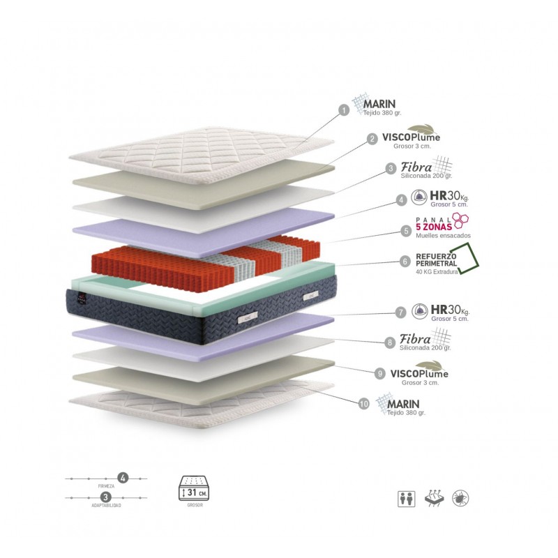 Incorpora varias capas de ViscoPlume y fibra, lo que proporciona una adaptabilidad única y un descanso cómodo. Además, su tejido stretch de alta calidad es altamente transpirable, favoreciendo una regulación térmica perfecta durante el sueño.