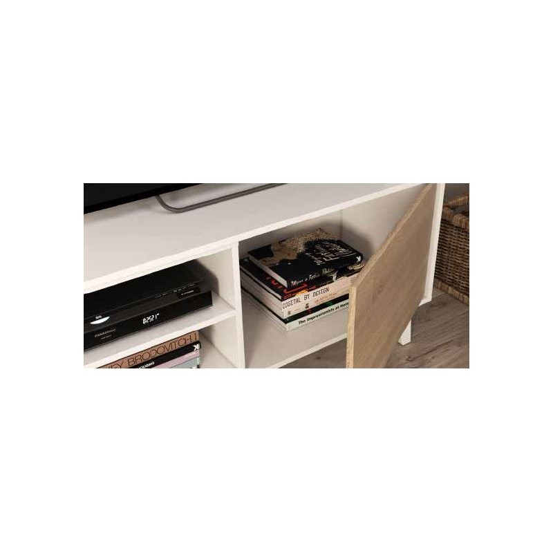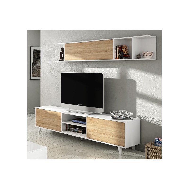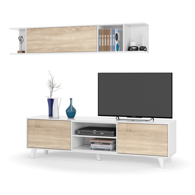 Muebles de TV y vitrina mod. Dover-W, fabricados en melamina de alta calidad, canteado en PVC. Patas de madera maciza. Estilo Nórdico y un diseño que no pasa desapercibido. Sistema de apertura de puertas con expulsores. Color: Blanco Brillo / Roble.