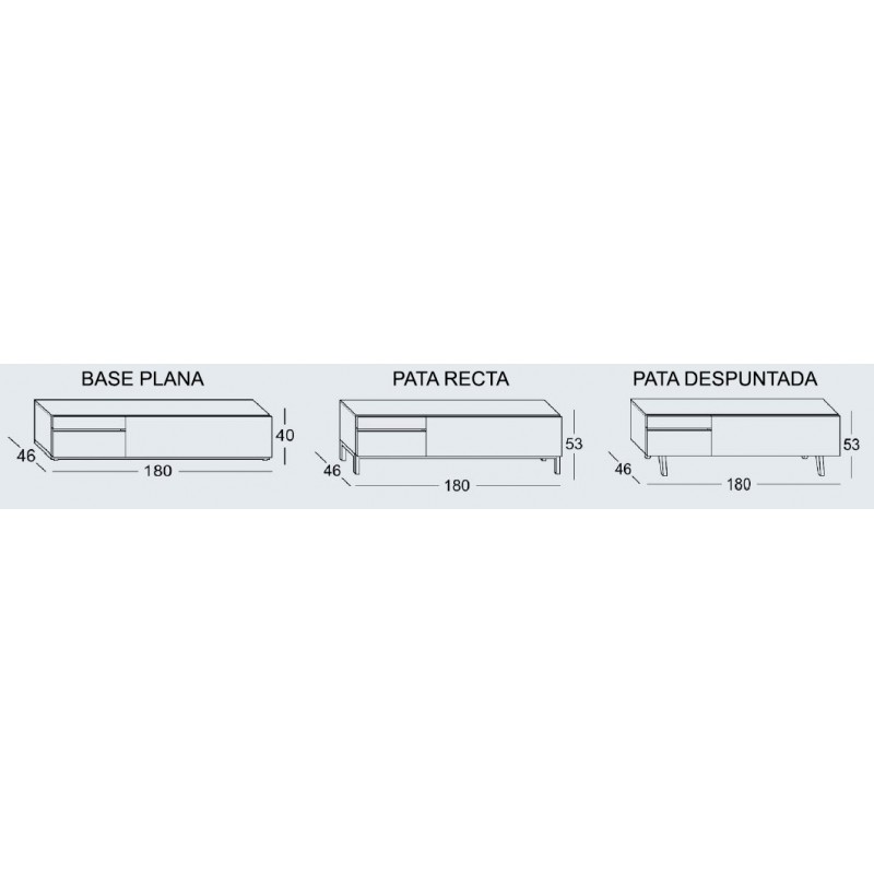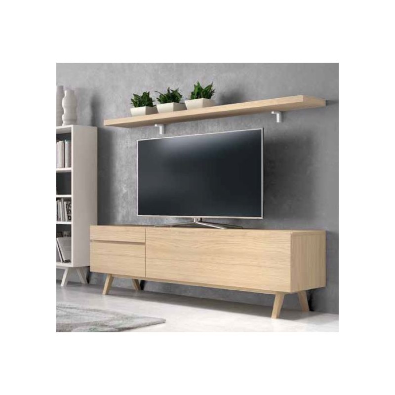 Mueble de TV + estante modelo ZOE 06. Módulo bajo para televisión con 2 cajones y una puerta abatible. Estante de 180 cm. de largo. Fabricado en madera de pino macizo. Posibilidad de elegir entre 3 tipos de base: plana, con patas rectas o con patas despuntadas.