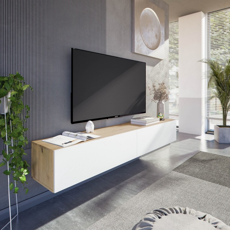 Mueble de TV con 2 puertas modelo Aberdeen, para colgar en la pared con puertas batientes (pistón 60Nw). Sistema de apertura de las puertas abatibles tipo “PUSH”. Mueble fabricado en melamina de alta calidad, canteado en PVC. Color: Blanco Artik / Roble Nodi.