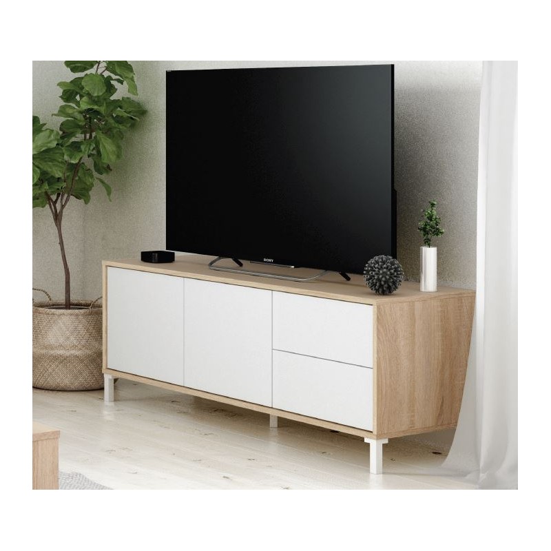 Mueble de TV de 2 puertas y 2 cajones modelo Allan, fabricado en melamina de alta calidad, canteado en PVC. Mueble funcional de lineas rectas, con un diseño moderno. Patas rectas de color Antracita.