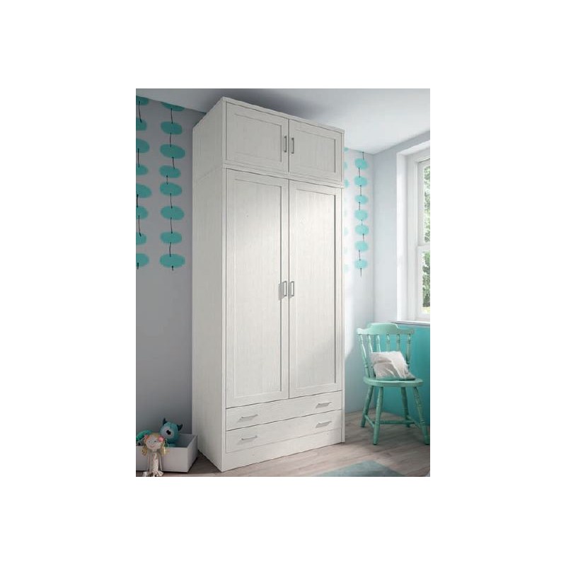 Armario de pino mod. Coral con 2 puertas, 2 cajones inferiores y altillo superior de 2 puertas. Fabricado en madera de pino macizo. El armario cuenta con un estante interior y una barra para colgar.