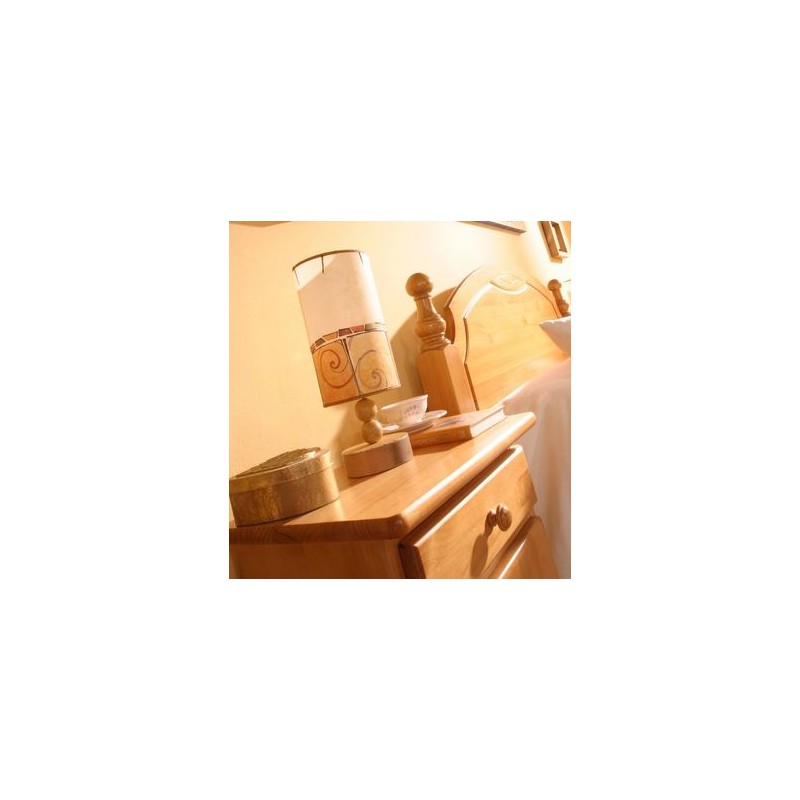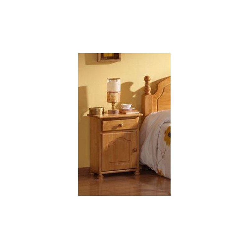 Mesita de noche de un cajón y una puerta. Fabricada en madera de pino macizo.