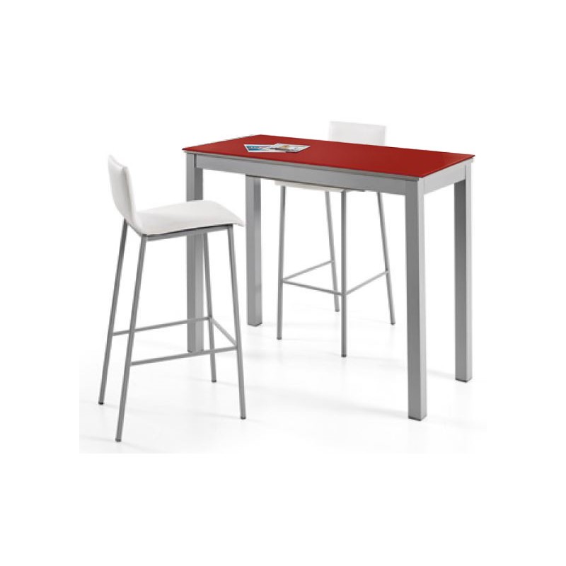 Mesa modelo Daimiel, extensible a lo ancho, con tapa de cristal (altura total 93 cm. aprox.). Fabricada con chasis metálico pintado en color plata y patas metálicas en color plata o blanco (a elegir). Encimera de cristal extensible por su parte ancha mediante guías correderas, las patas se desliza hacia delante y en el hueco se ubica el extensible. El extensible está fabricado en laminado color plata o blanco (escribir el color deseado en el campo "personalización de productos").