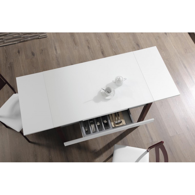 Mesa de cocina modelo Oviedo extensible, chasis y frente del cajón laminados únicamente en color Blanco. Extensibles automáticos a los lados mediante guías correderas, la medida del extensible es de 60 cm, (30 cm a cada lado) están fabricados en laminado de baja presión a juego de la encimera. La mesa lleva un cajón oculto en el frente, que corre sobre guías metálicas. Patas metálicas de color plata o blanco (a elegir).