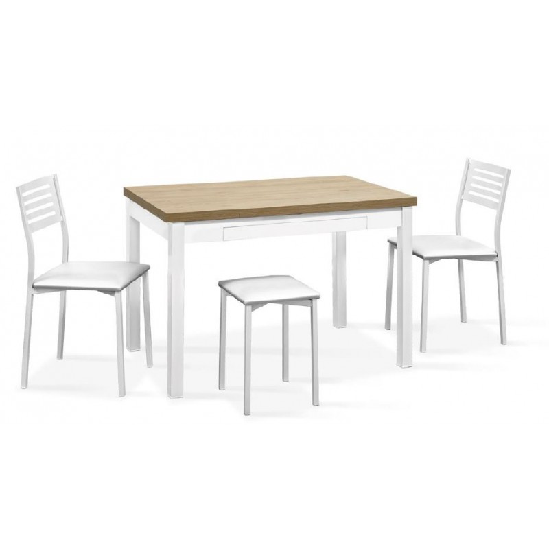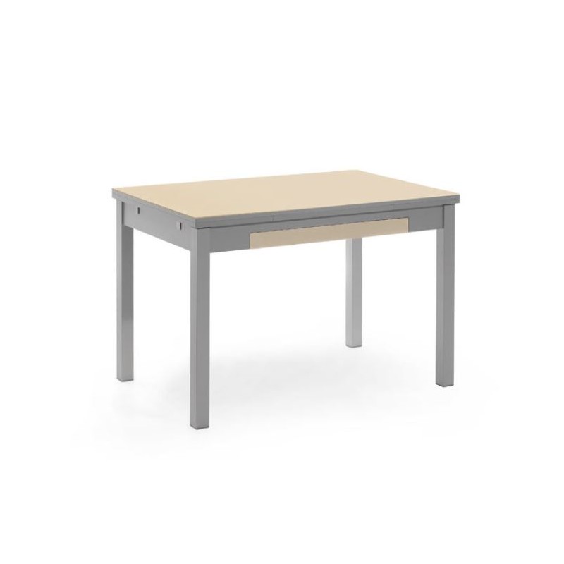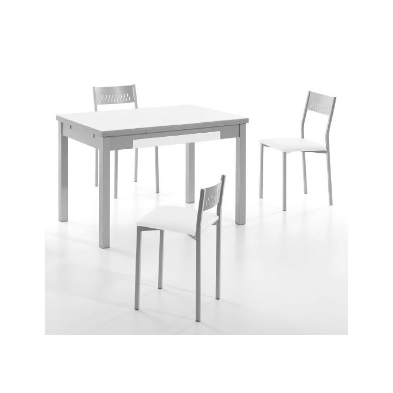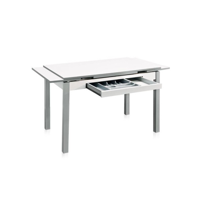 Mesa de cocina modelo Casandra con tapa laminada, extensible. Patas metálicas color plata, blanco o negro. Encimera, chasis y extensibles fabricados en laminado baja presión. Extensibles automáticos a ambos lados (30 cm. por lado). El cajón corre sobre guías metálicas, opcionalmente el cajón se puede servir con cubertero. Cantos en PVC. Tapa y alas en el mismo color laminado.