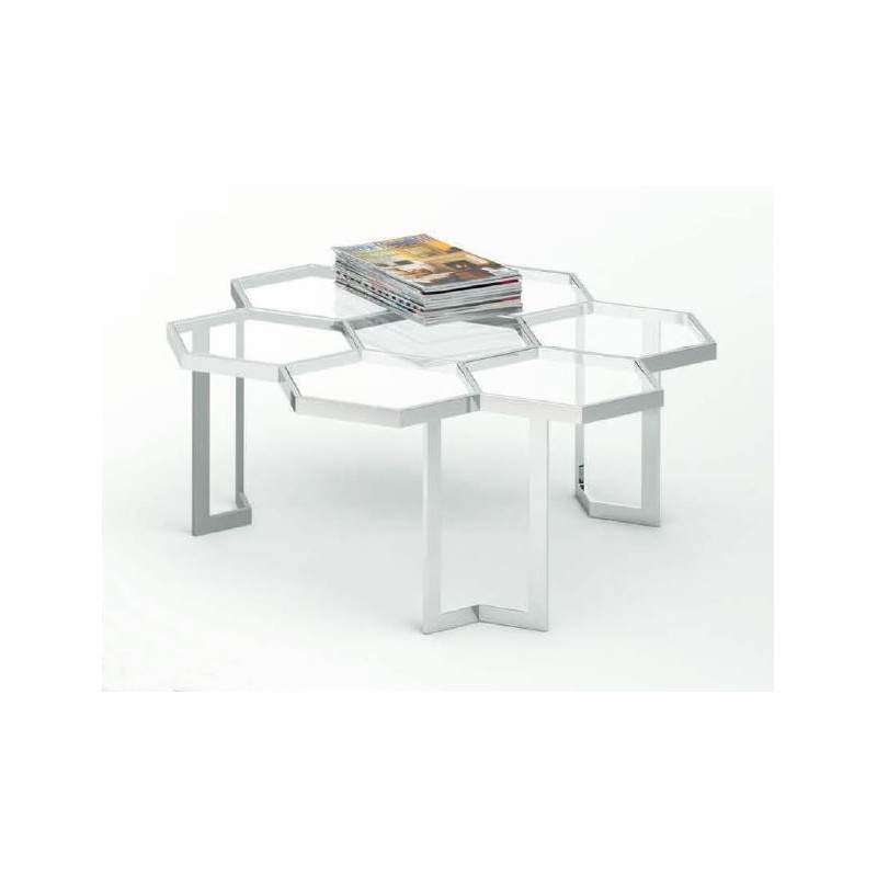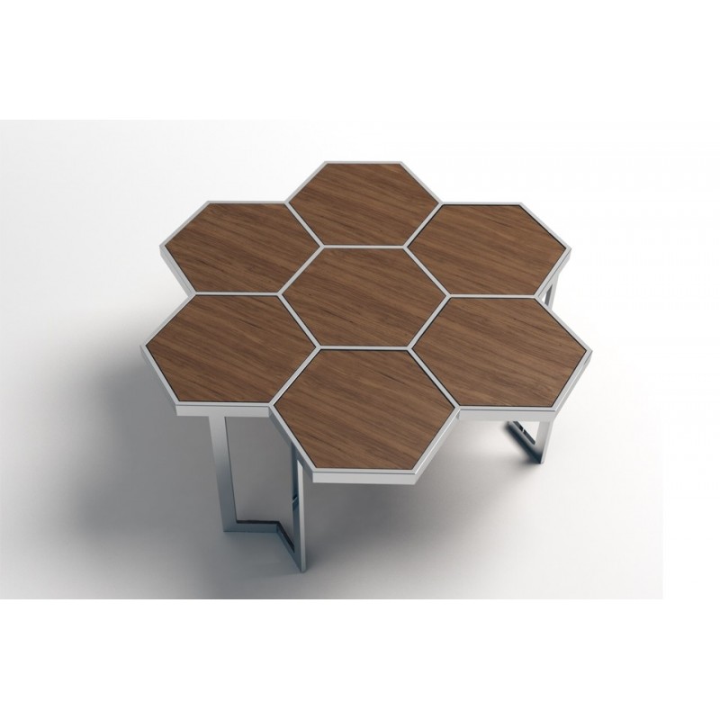 Mesa de Centro modelo Honey con medidas 90x85x45. Está compuesta por una estructura metálica de 42 piezas de acero inoxidable soldadas en forma de Hexágonos. Las tapas están compuestas por Hexágonos independientes de madera en nogal americano o cristal.