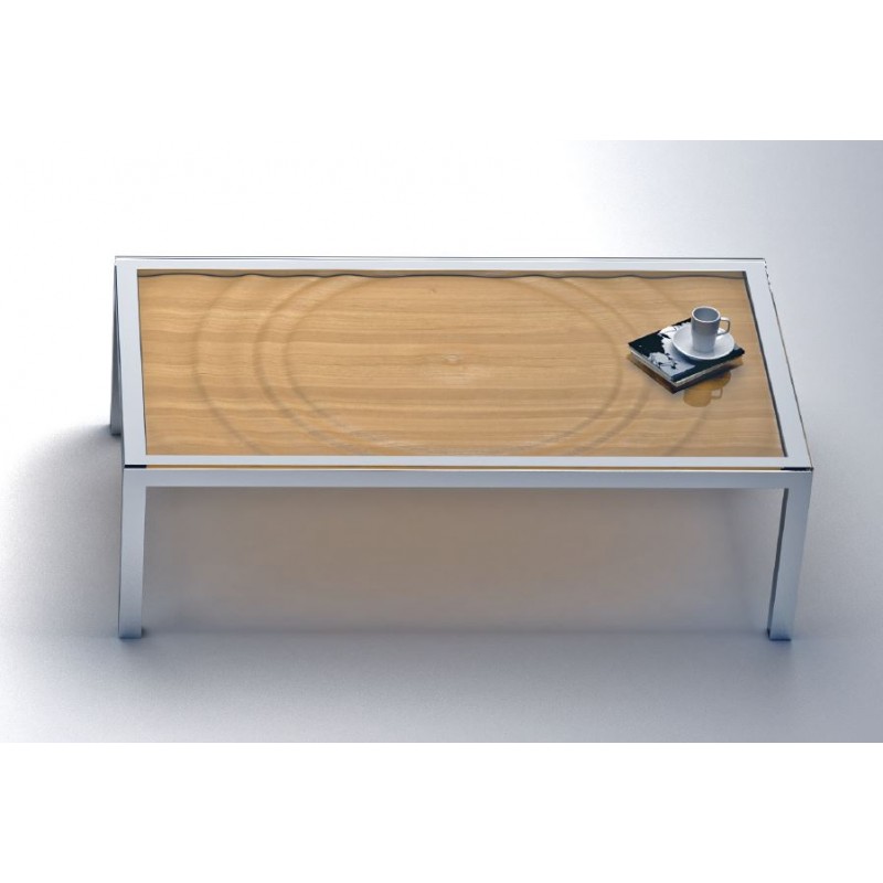 Mesa de centro modelo Aqua (Rectangular), la tapa de esta mesa simula la caida de una gota de agua sobre el tablero presentando unas ondulaciones en la madera ubicada bajo la tapa de cristal de 10 mm. Chasis fabricado en acero cromado de alta calidad.