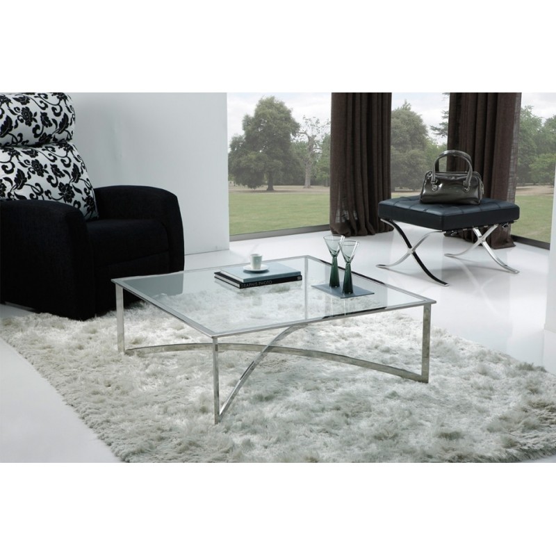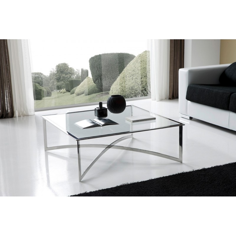 Mesa de centro modelo Gotika, cuadrada o rectangular. Tapa de cristal transparente de 6 mm. de grosor y chasis fabricado en acero inoxidable.