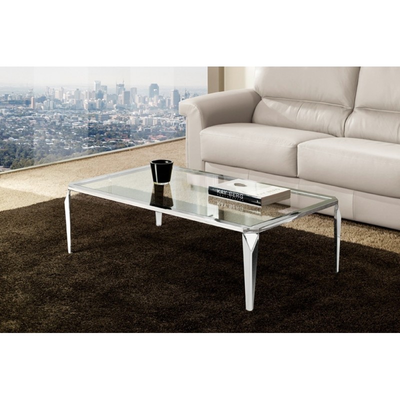 Mesa de centro modelo DaVinci, cuadrada o rectangular. Tapa de cristal transparente de 6 mm. de grosor y chasis fabricado en acero inoxidable.