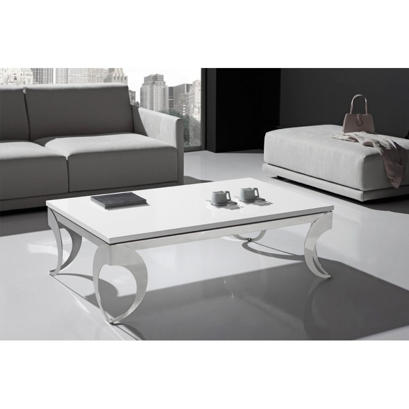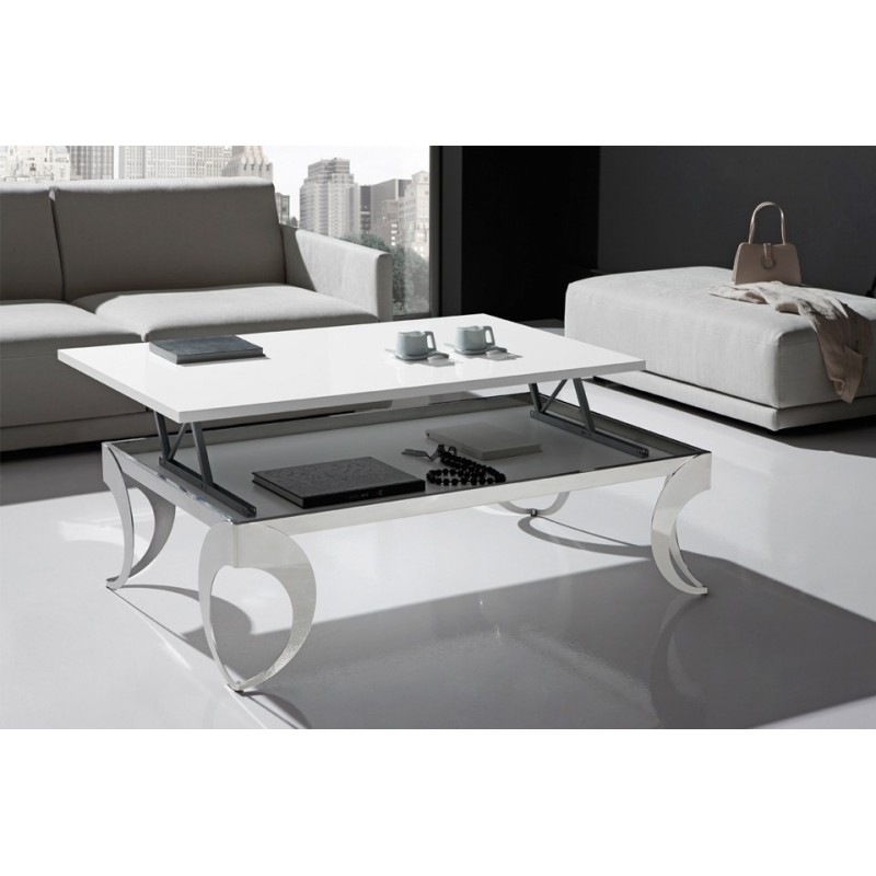 Mesa de centro elevable modelo Olimpia. Tapa y bandeja de madera lacada en color blanco brillo. Chasis y patas fabricadas en acero inoxidable.