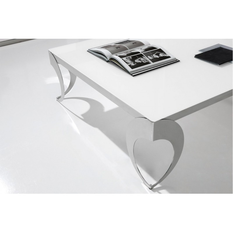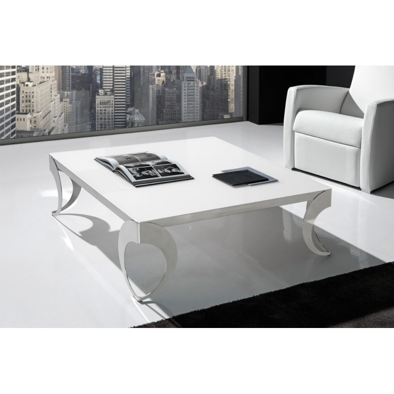Mesa de centro elevable modelo Olimpia. Tapa y bandeja de madera lacada en color blanco brillo. Chasis y patas fabricadas en acero inoxidable.