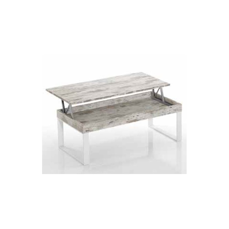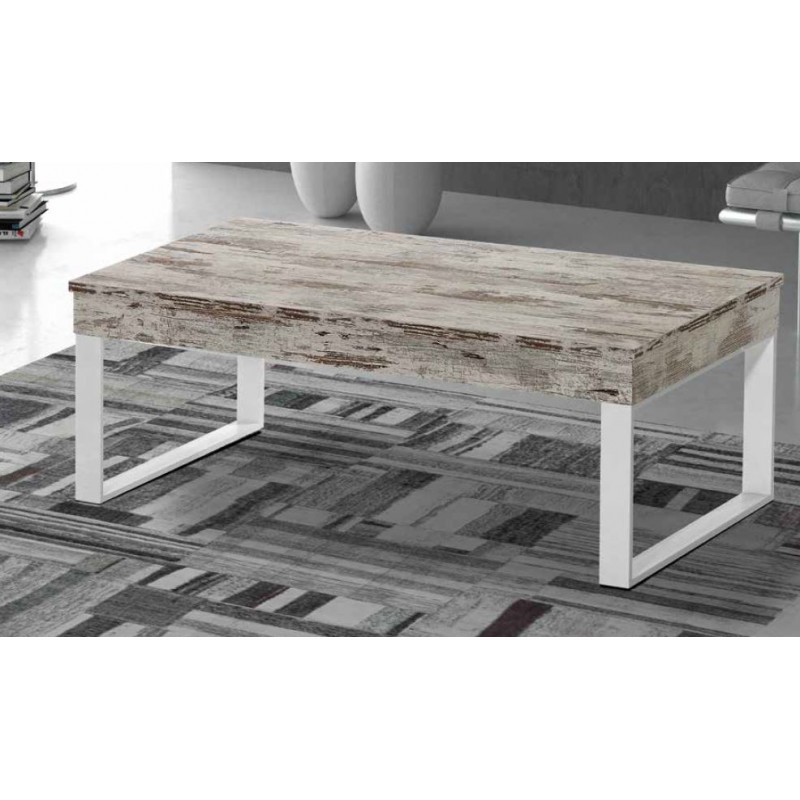 Mesa de centro elevable de 100x50x41 cm., fabricada en ECO madera vintass (19 mm. de grosor). Patas metálicas pintadas en epoxi color blanco.