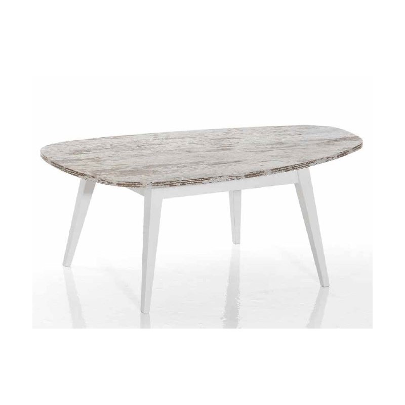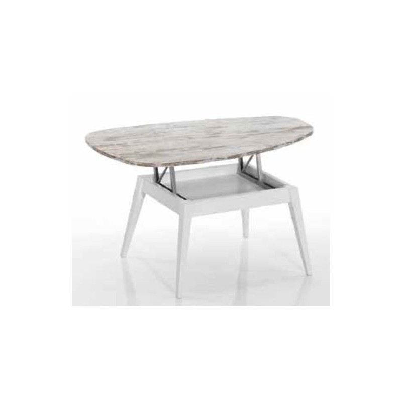 Mesa de centro elevable de 110x60x42 cm., tapa fabricada en ECO madera vintass (19 mm. de grosor). Base y patas fabricadas en madera de haya lacadao en blanco mate.