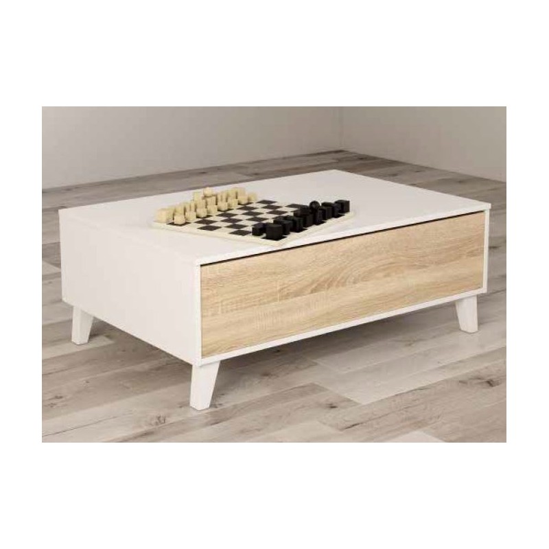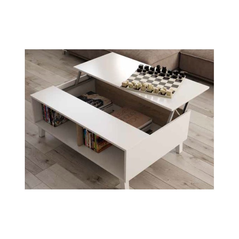 Mesa de de centro elevable mod. Dover-W, fabricada en melamina de alta calidad, canteado en PVC. Mesa de estilo Nórdico económica, con un diseño que no pasa desapercibido. La tapa es elevable con un espacio interior para guardar objetos. Además cuenta con 2 huecos laterales que amplian su funcionalidad.