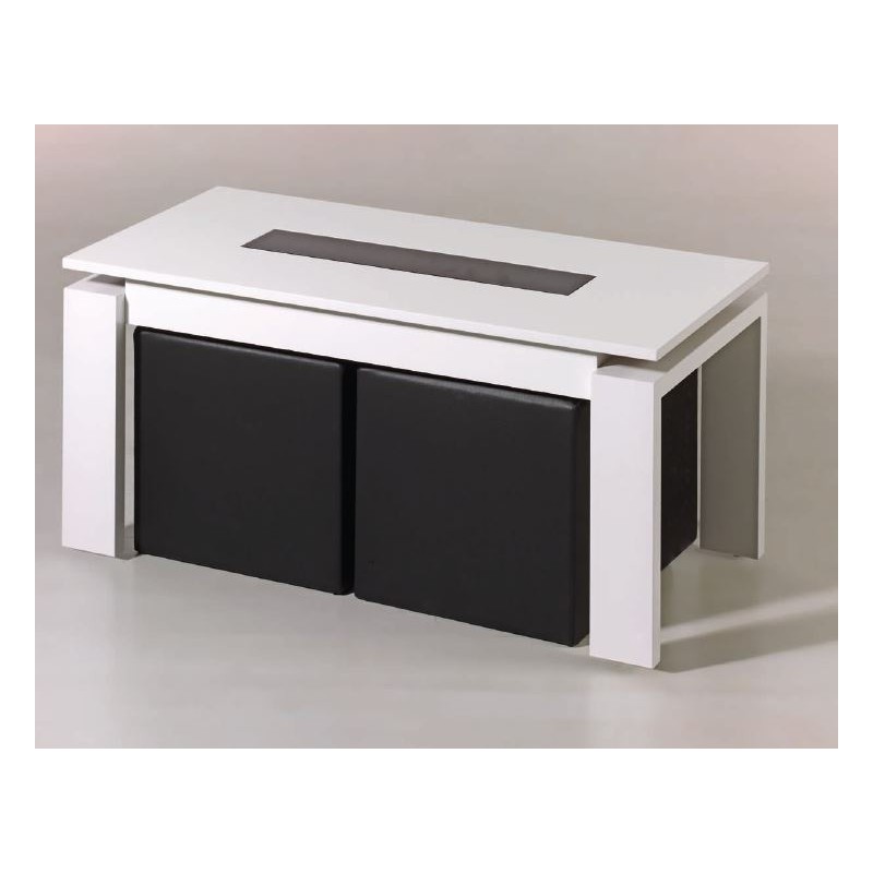 Mesa de centro elevable de 100x50x44, fabricada en madera de haya, con cristal en la tapa. Incluye 2 puffs tapizados en polipiel de 37x37x32 cm. de alto.