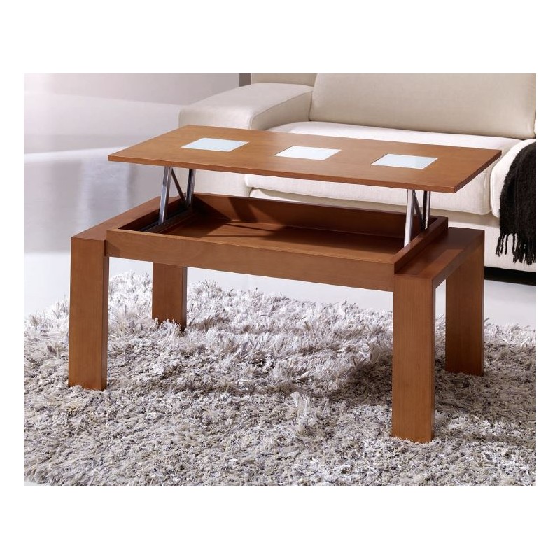 Mesa de centro elevable de 100x50x44, fabricada en madera de haya, con 3 cristales en la tapa.