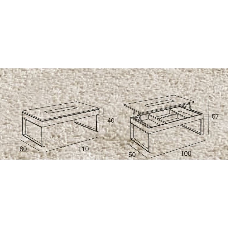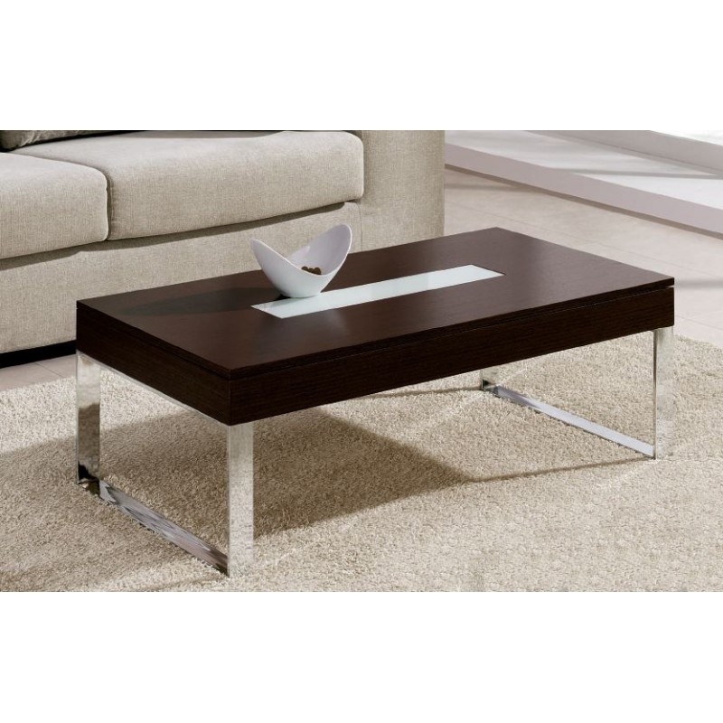 Mesa de centro elevable de 100x50x40 cm. de alto. Incorpora un cristal rectangular en la tapa, color a elegir. Mesa disponible en colores lacados y barnizados: nogal americano, roble natural o mukali. Patas metálicas cromadas.