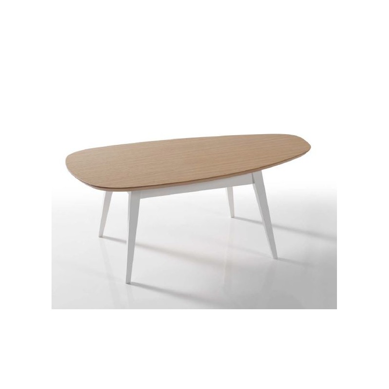 Mesa de centro elevable de 110x60x42 cm. de alto. Tapa fabricada en DM contrachapado de chapa natural de Roble con barnizado acrílico. Chasis y patas en madera de haya lacado en color Blanco.