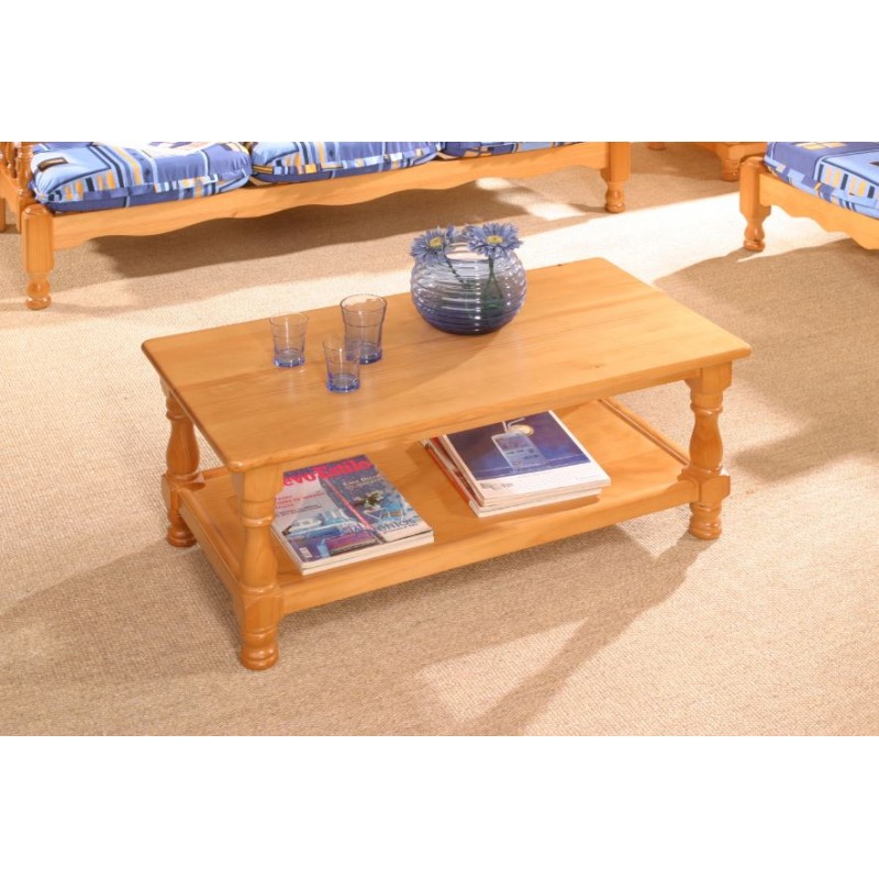 Mesa de centro torneada (50x96) con revistero, fabricada en madera de pino maciza, tapa de madera (disponible mismo modelo con tapa de cristal).