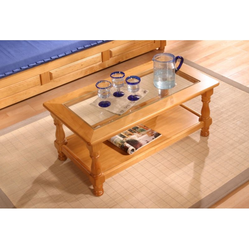 Mesa de centro torneada (50x96) con revistero, fabricada en madera de pino maciza, tapa de cristal (disponible mismo modelo con toda la tapa de madera).