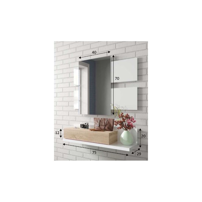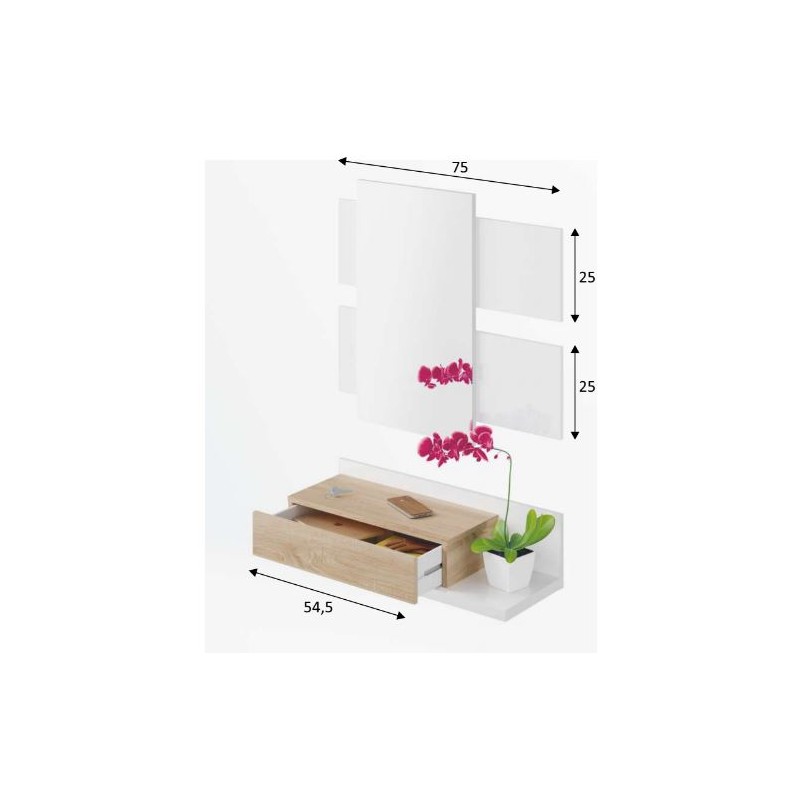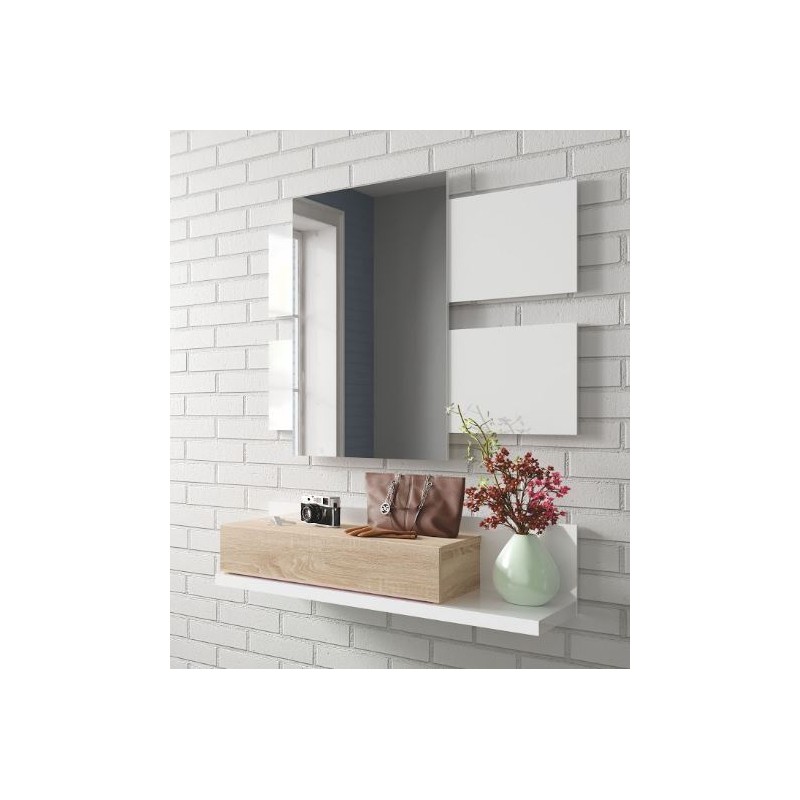Recibidor con espejo modelo Ben, color roble combinado con blanco, acabado en melamina de alta calidad, cantos en PVC. Dispone de un cajón. Incluye espejo.
