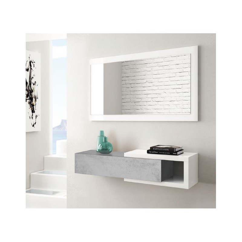 Recibidor con espejo modelo Ness Two, acabado en melamina de alta calidad, cantos en PVC. Este recibidor es reversible, dispone de un módulo con cajón que podemos ubicar en el lado derecho o en el lado izquierdo de la composición. Color Blanco Artik, combinado con Cemento. Incluye espejo.