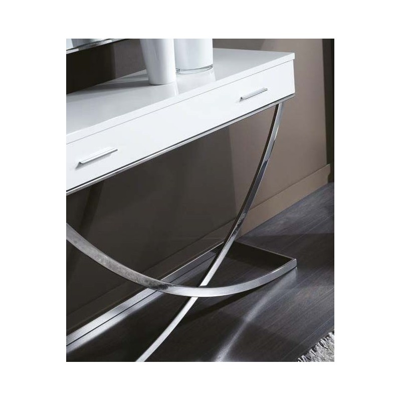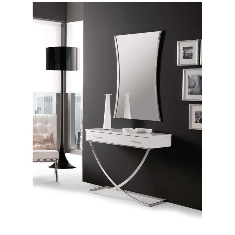 Recibidor con espejo modelo Grial. Mueble auxiliar en color Blanco con estructura fabricada en acero inoxidable, cuenta con un cajón con 2 tiradores. Espejo incluido con marco en acero inoxidable.