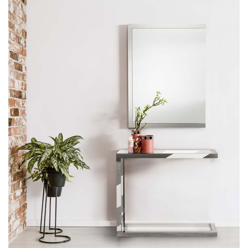 Recibidor con espejo modelo Cuadrado. Consola con medidas 90x35x75 cm. de alto fabricada en acero inoxidable. Tapa y base de cristal transparente de 6 mm. de grosor. Espejo incluido con marco en acero inoxidable con medidas 73x97 cm. de alto.
