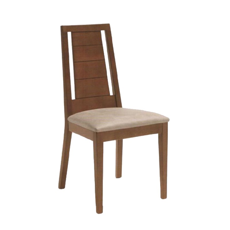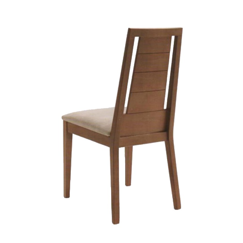 Silla modelo M502 fabricada en madera de haya. Asiento tapizado sobre tablero de partículas. Respaldo con aperturas decorativas laterales.