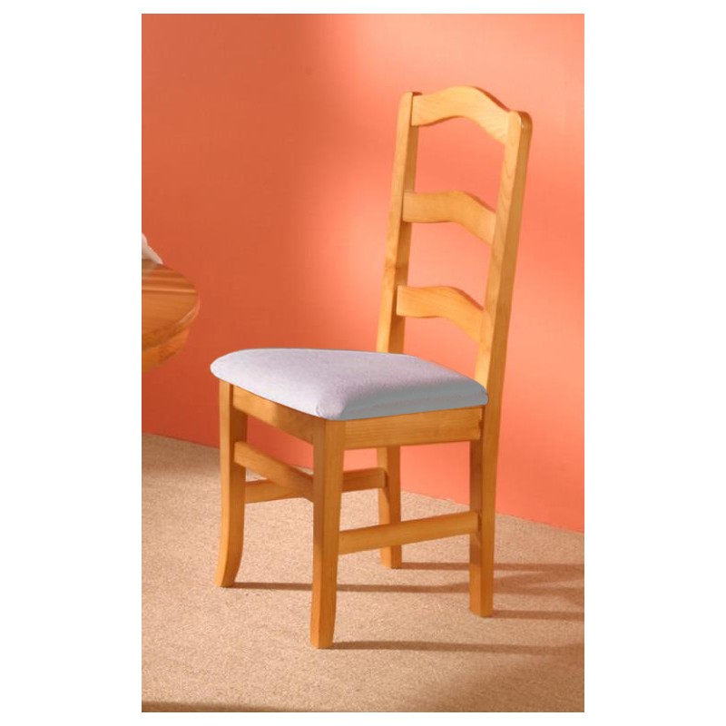 Silla modelo J85, fabricada en madera de pino, con asiento tapizado sobre tablero de partículas.