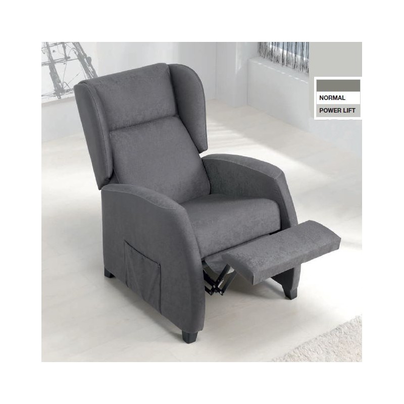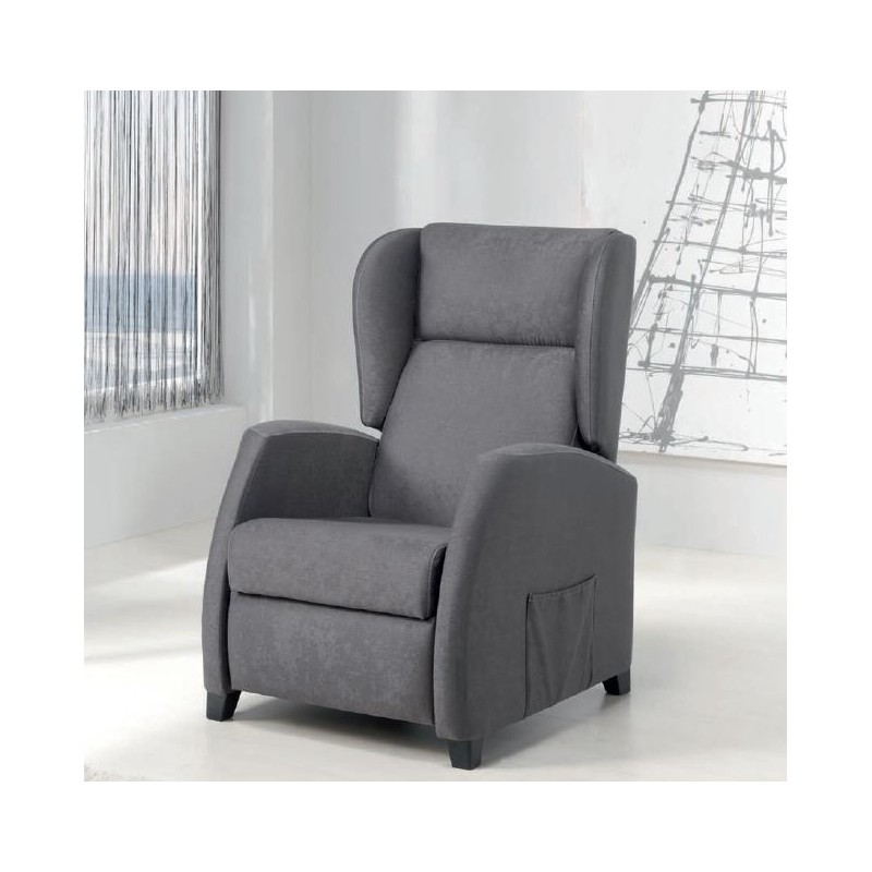 Sillón relax mod. Mega, fabricado con armazón de madera de pino y tablero de partículas recubierto de espuma de poliuretano, espuma de poliuretano de 28 kg de densidad, mecanismo relax pintado en epoxi negro. Disponible con diferentes tipo de mecanismo para este modelo, seleccionar la opción deseada en el desplegable. Patas de madera en color wengué o nogal.