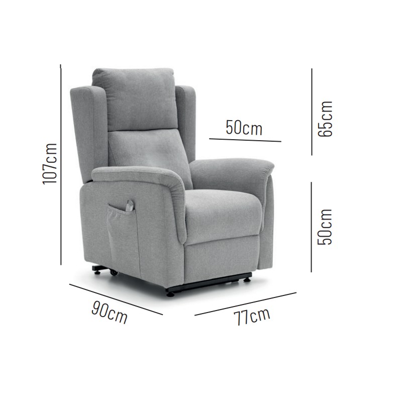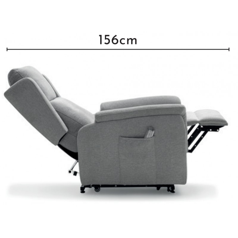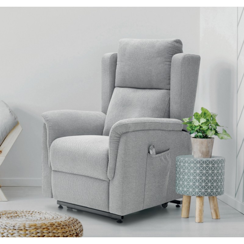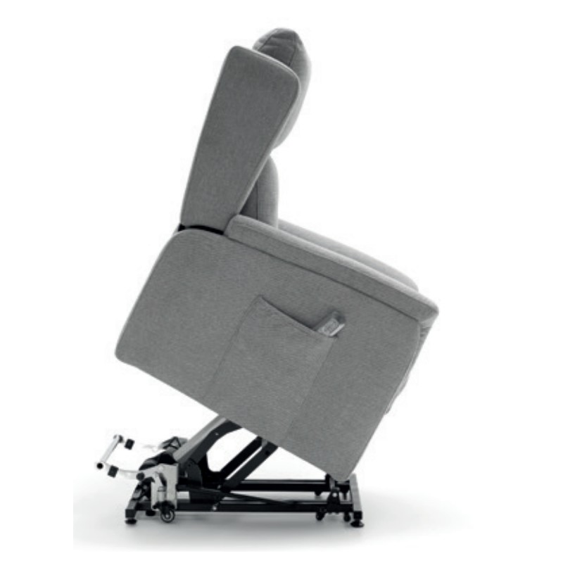 Sillón relax motorizado mod. Tommy, con ruedas para el desplazamiento de la persona sentada con movilidad reducida y sistema de elevación motorizado powerlift (ayuda a la incorporación de personas). Apertura relax con 2 motores independientes (respaldo reclinable y reposapiés elevable). La apertura motorizada se acciona mediante un mando que se puede guardar en el bolsillo lateral del brazo.