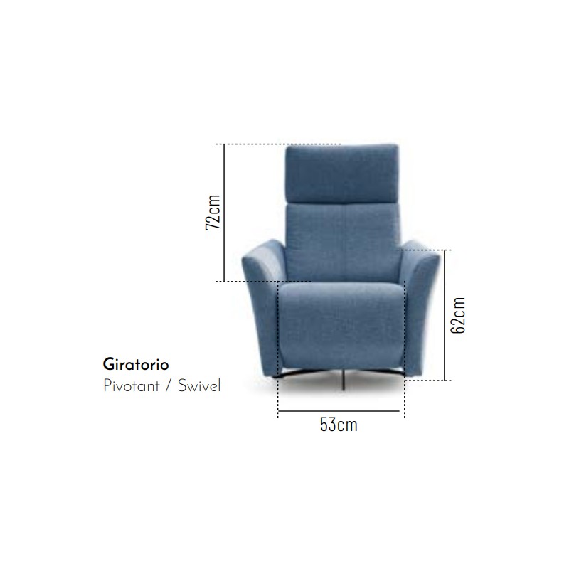 Sillón relax mod. Cubic giratorio. Con apertura manual de serie u opción de apertura motorizada mediante botonera integrada en el brazo. La apertura motorizada permite subir los piés y reclinar el respaldo sin esfuerzo desde la botonera integrada. Base diseño aspa giratoria en color negro. Almohada de respaldo desenfundable. Asiento y reposapiés con manta acolchada, desenfundable.
