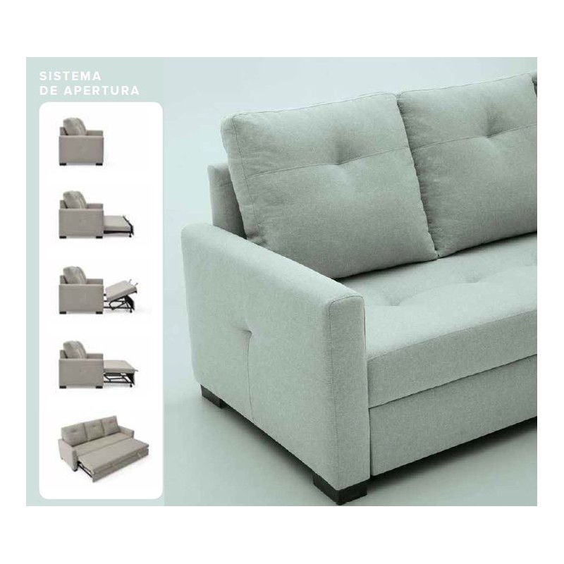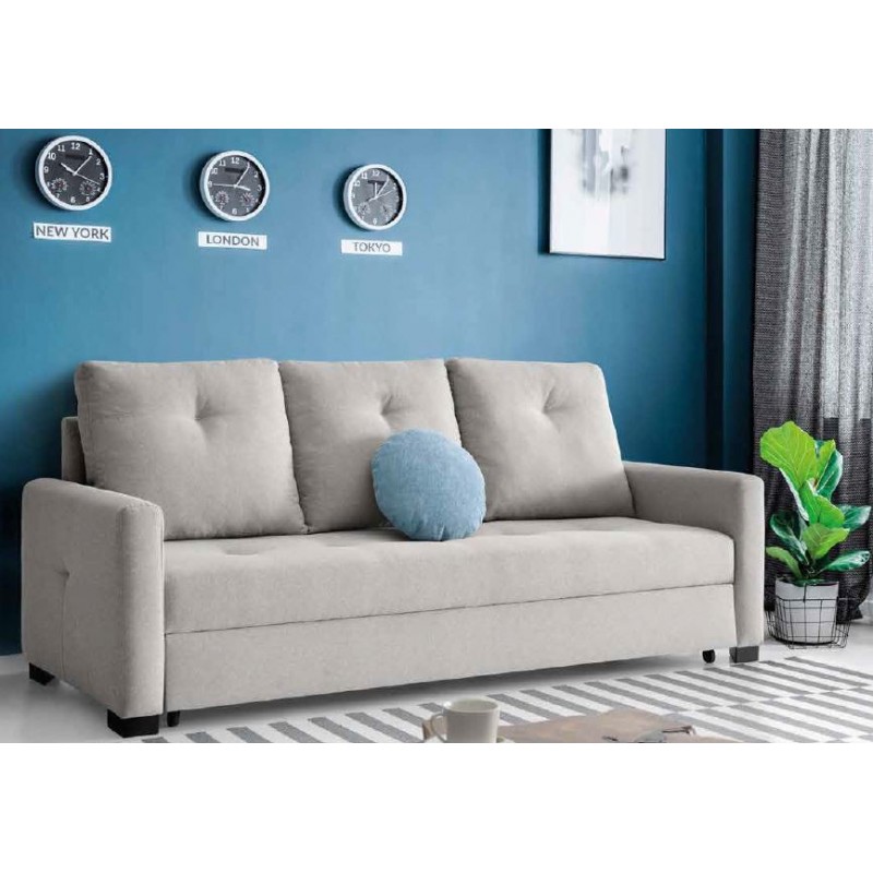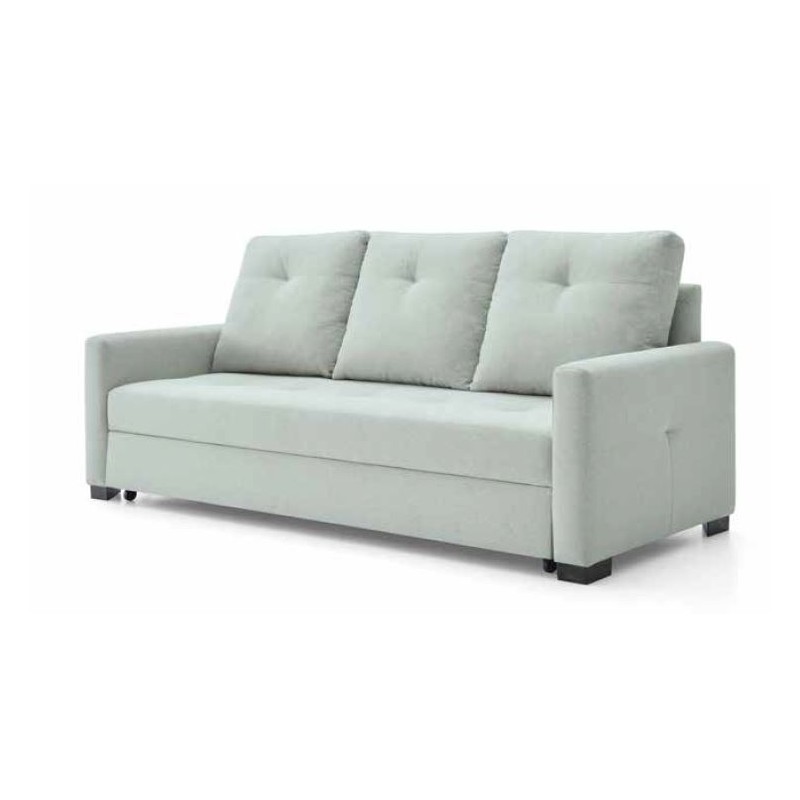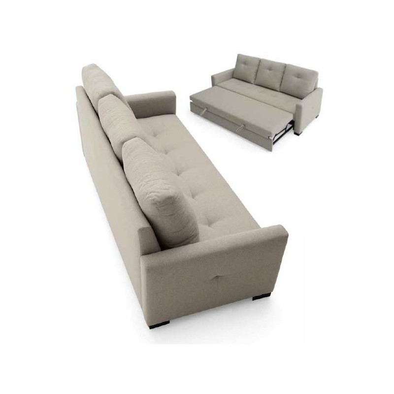 Sofá cama de 3 plazas modelo Paulino. Dispone de un arrastre elevable para formar una amplia cama de matrimonio de 145x190 cm. extensible.