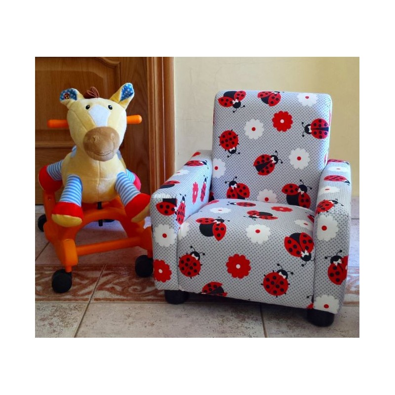 Mini sillón infantil de tamaño reducido, fabricado con armazón de madera de pino. Asiento y respaldo de gomaespuma de 28 kg. de densidad.