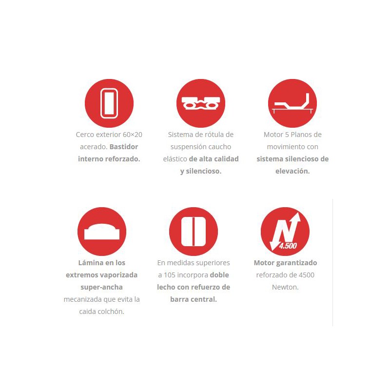 - En medidas superiores a 105 cm, incorpora doble lecho con refuerzo de barra central.