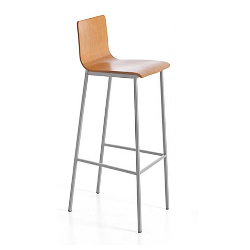 Taburete alto modelo Cobalto 75R, con chasis metálico de alta calidad en color plata o blanco, asiento y respaldo fabricados en contrachapado de madera (cerezo o natural) y lacados texturizados (aluminio o blanco).