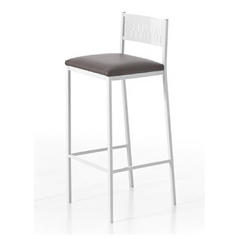 Taburete de cocina alto modelo Cádiz 75R. Chasis y respaldo metálico de alta calidad en color plata o blanco, asiento tapizado. Se fabrica silla y taburetes con respaldo a juego.