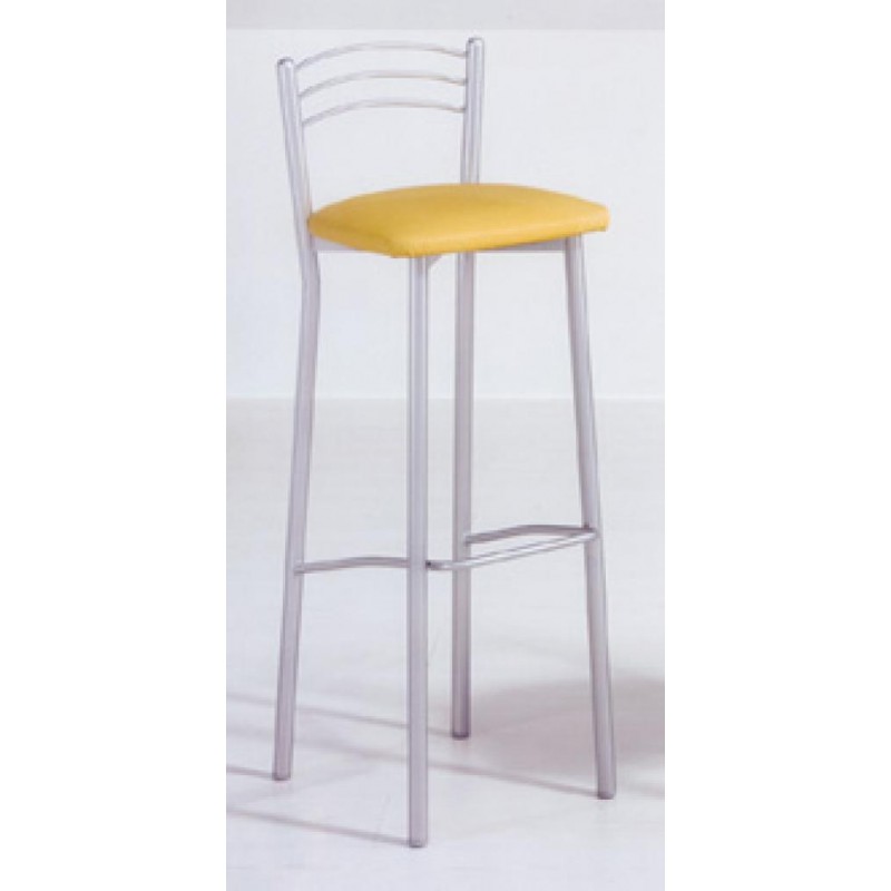 Taburete de cocina alto con respaldo modelo Lucia 75R. Respaldo y chasis fabricado en aluminio de alta calidad en color plata y posibilidad de que el asiento se fabrique en madera, tapizado o lacado texturizado. Se fabrica silla y taburetes más bajos a juego.