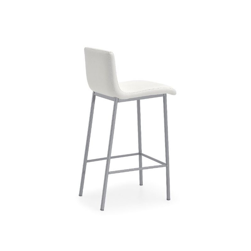 Taburete medio de cocina modelo Karina 60R tapizado, con chasis metálico de alta calidad en color plata o blanco. Asiento y respaldo fabricados en contrachapado de madera tapizado, con una elegante costura en su contorno.
