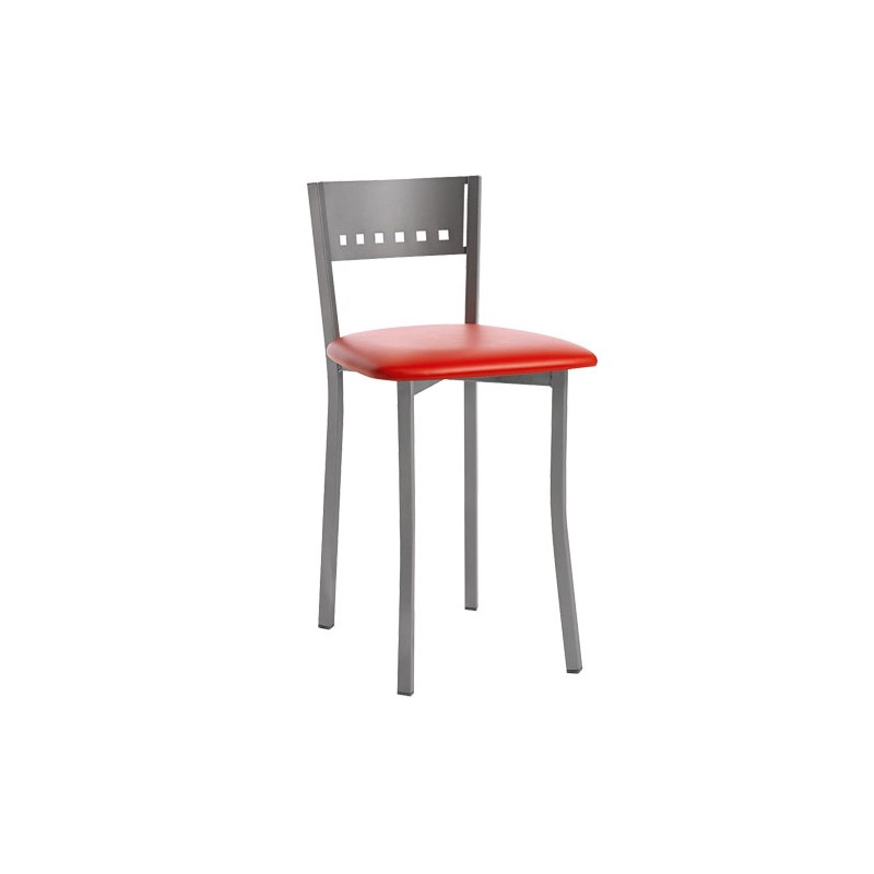 Taburete de cocina bajo con respaldo modelo Zoco 45R, con chasis y respaldo metálicos de alta calidad en color plata, posibilidad de que el asiento se fabrique en madera, tapizado o lacado texturizado. Se fabrica silla y taburete con respaldo para barra de cocina a juego.